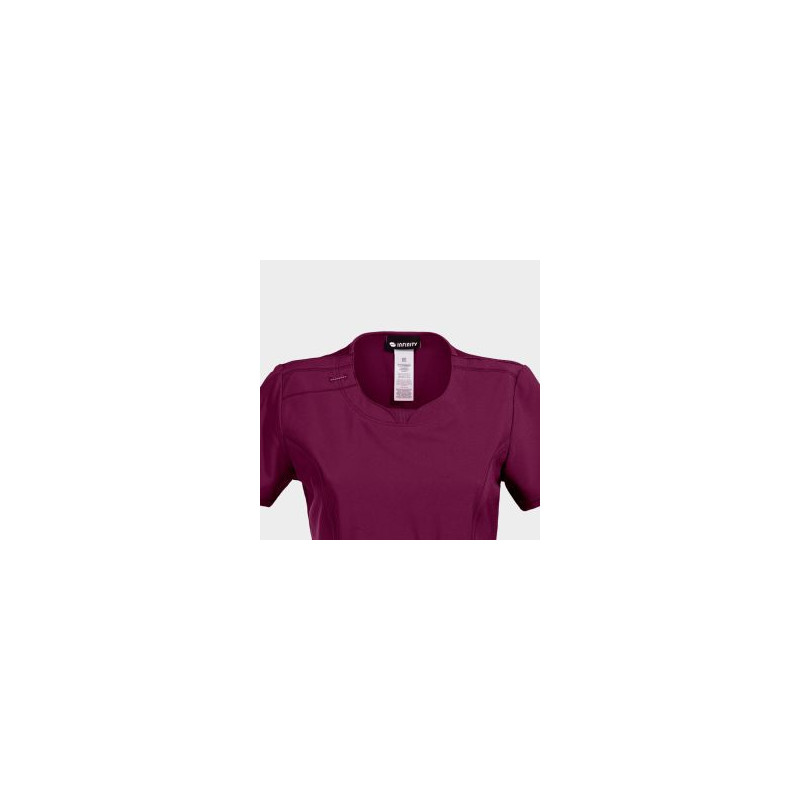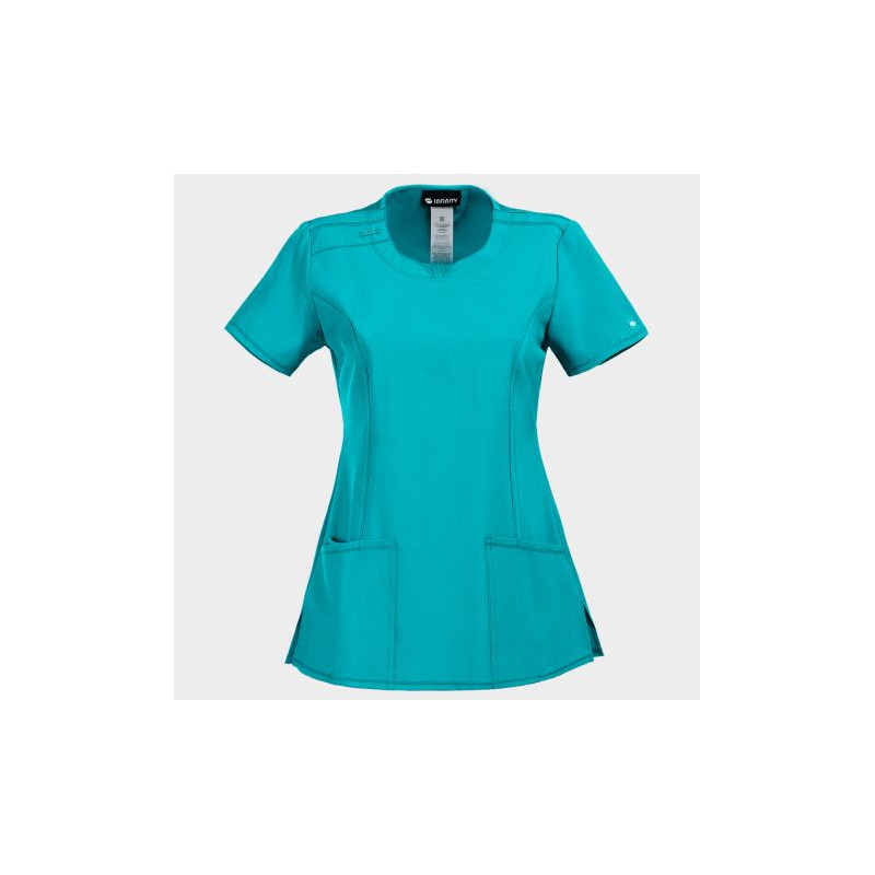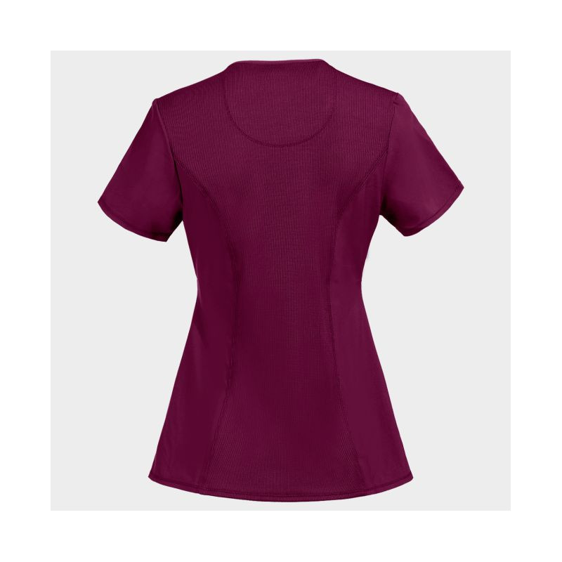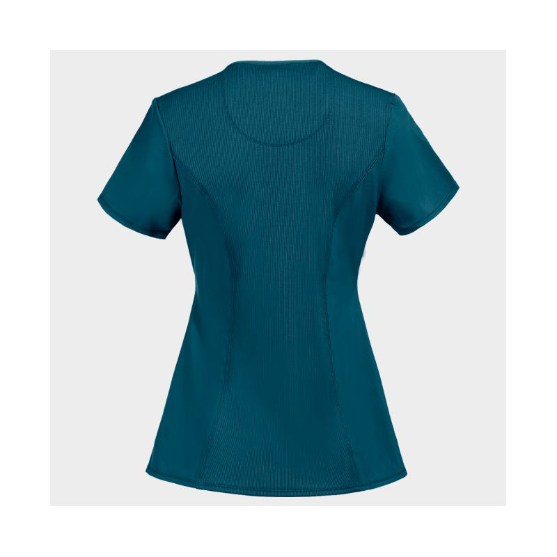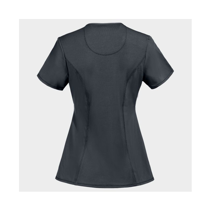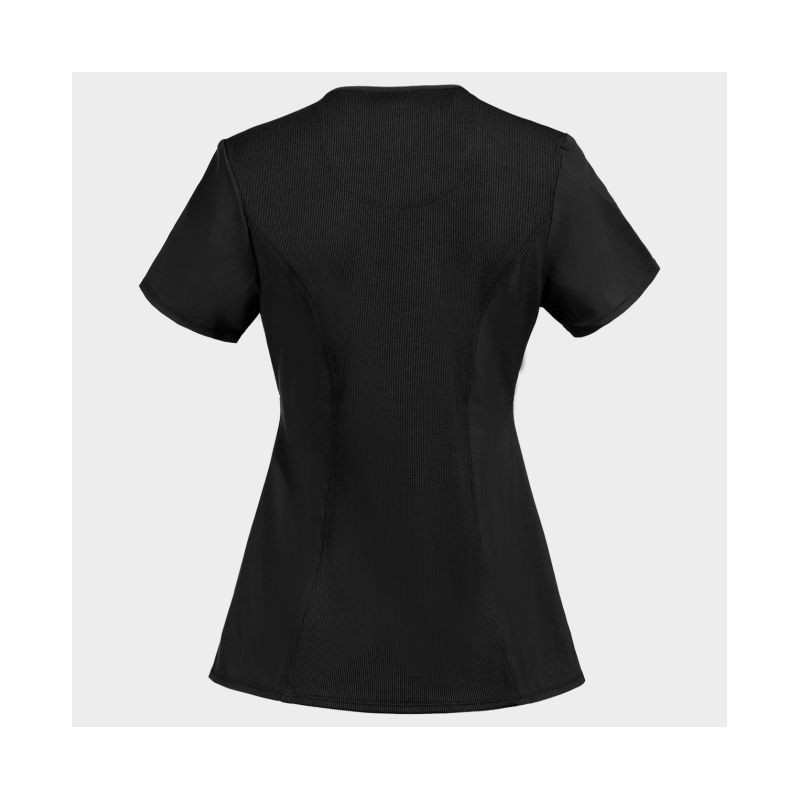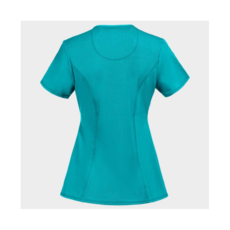 Основното предимство на модела е антимикробната обработка, осигуряваща допълнителна защита и свежест през целия ден – идеална за работна среда с повишени хигиенни изисквания. Изчистеното обло деколте с рипсена вложка допринася за комфорта и придава мек завършек на визията, като същевременно подчертава нежната женственост на силуета.