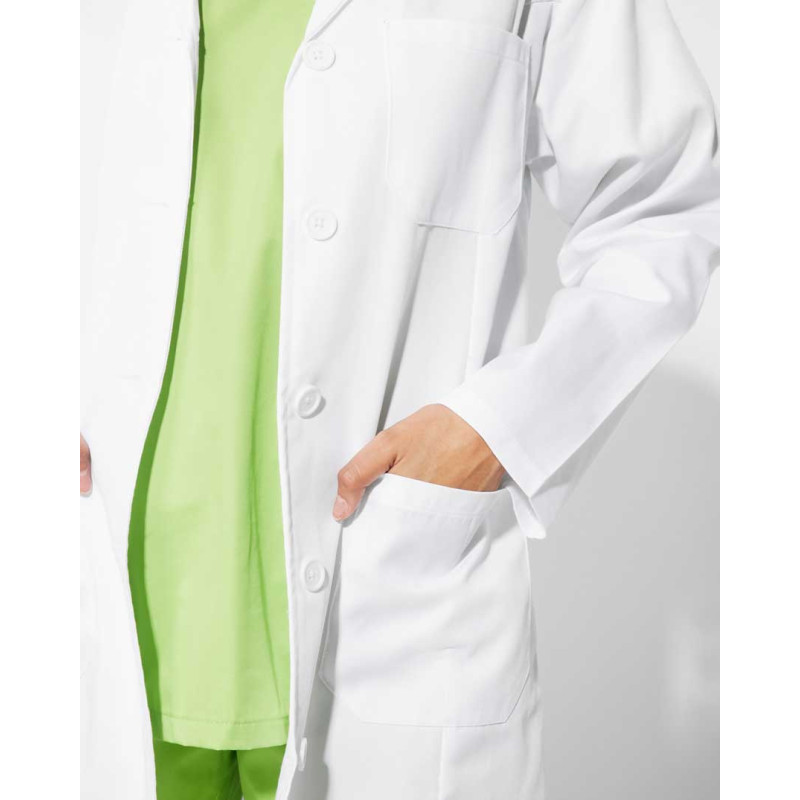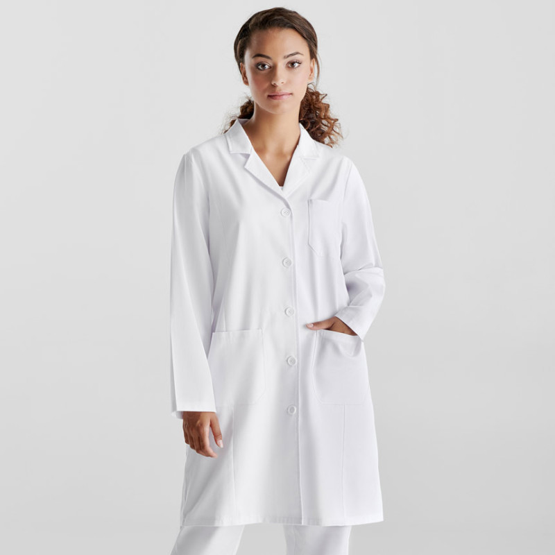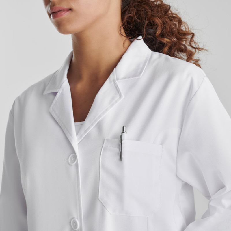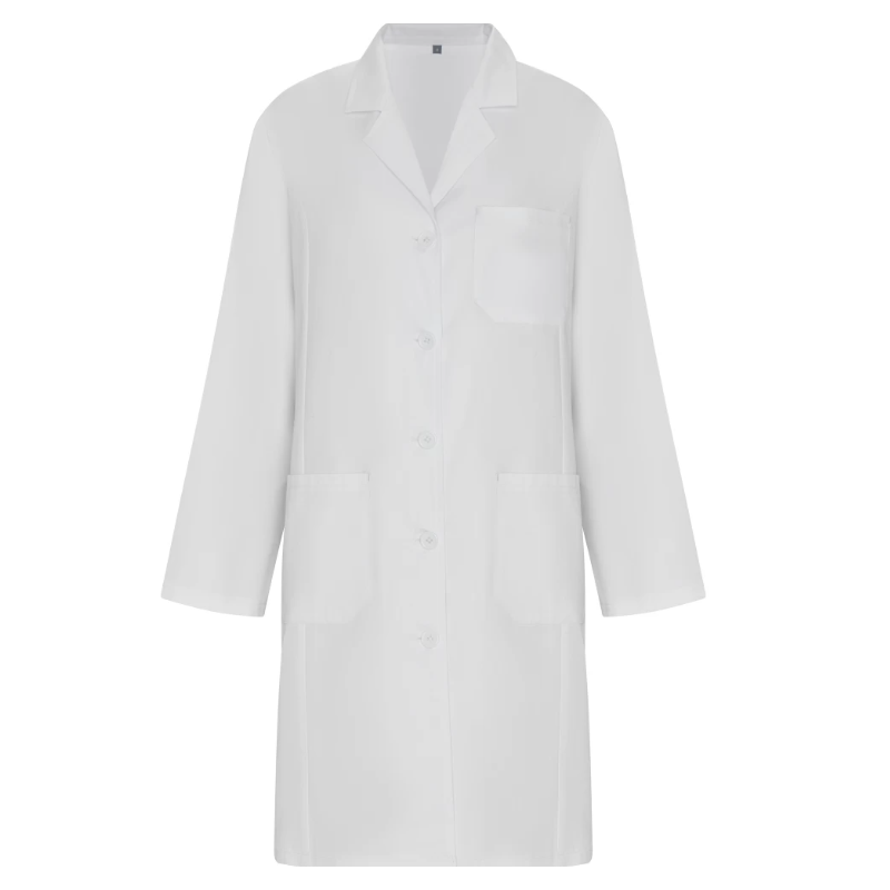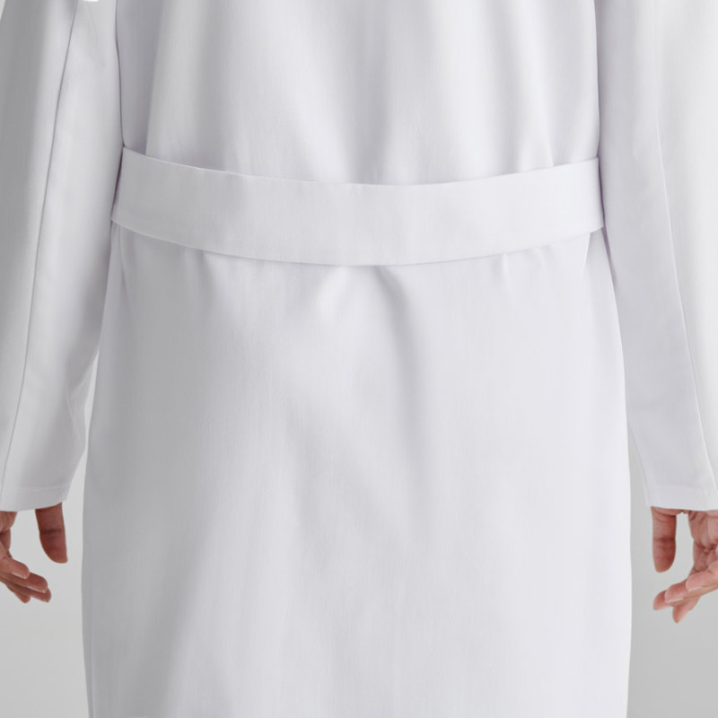 Елегантна медицинска престилка с дълги ръкави и вталена кройка. Престилката се закопчава с пет копчета и е снабдена с три джоба — два странични и един в горната част. Отзад при талията има регулационен колан за перфектно прилягане.