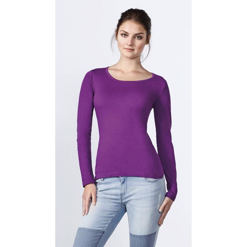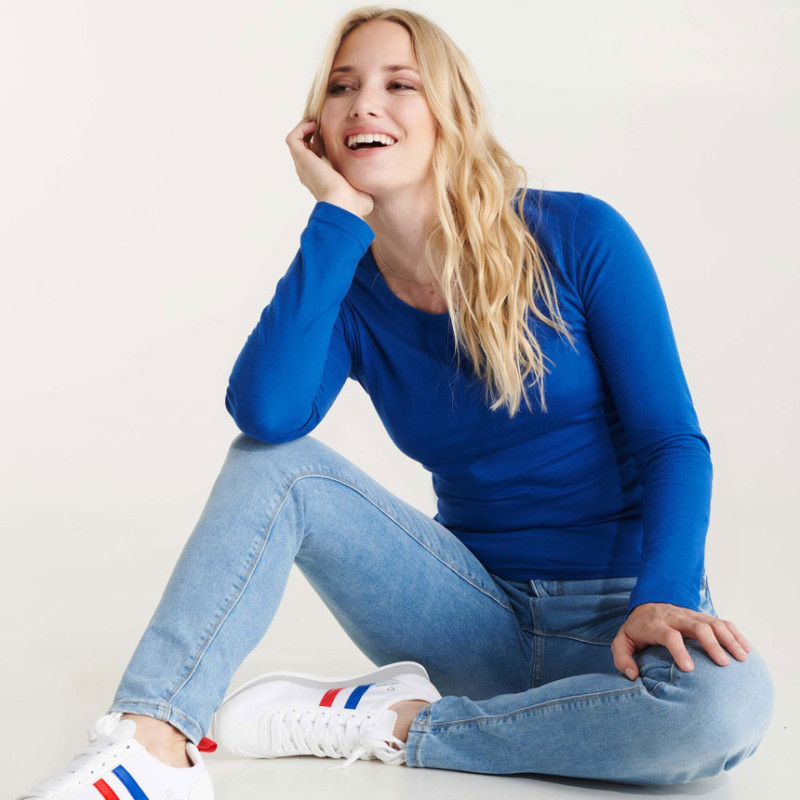 Изключително удобна и практична дамска тениска с дълъг ръкав и вталена кройка, която е подходяща за работната Ви среда и за свободното Ви време. Тениската е изработена от 100% памук