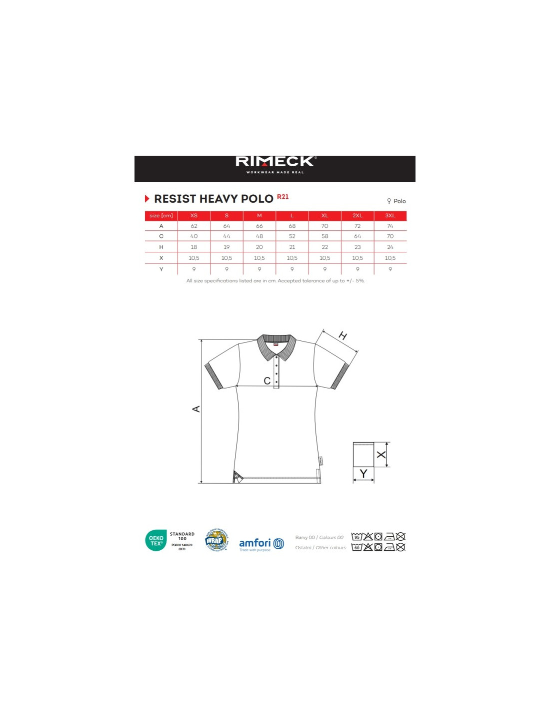 Тениската е изработена от плат със състав 100% обработен памук /предварително свит/, който е устойчив на високи температури. Може да се пере при максимална температура от 95 °C (за белия цвят) и 60 °C (за цветния цвят). Текстурата му е изпъкнала, а моделът включва странични цепки. Яката и маншетите са изработени от раирана материя в съотношение 1:1. Деколтето с пет копчета в същия цвят като основния материал. Вътрешната част на яката е облицована с лента от същия материал като основата. Допълнително, има подсилващи шевове на раменете, а джобът е прикачен отделно, което  позволява да се брандира лесно.