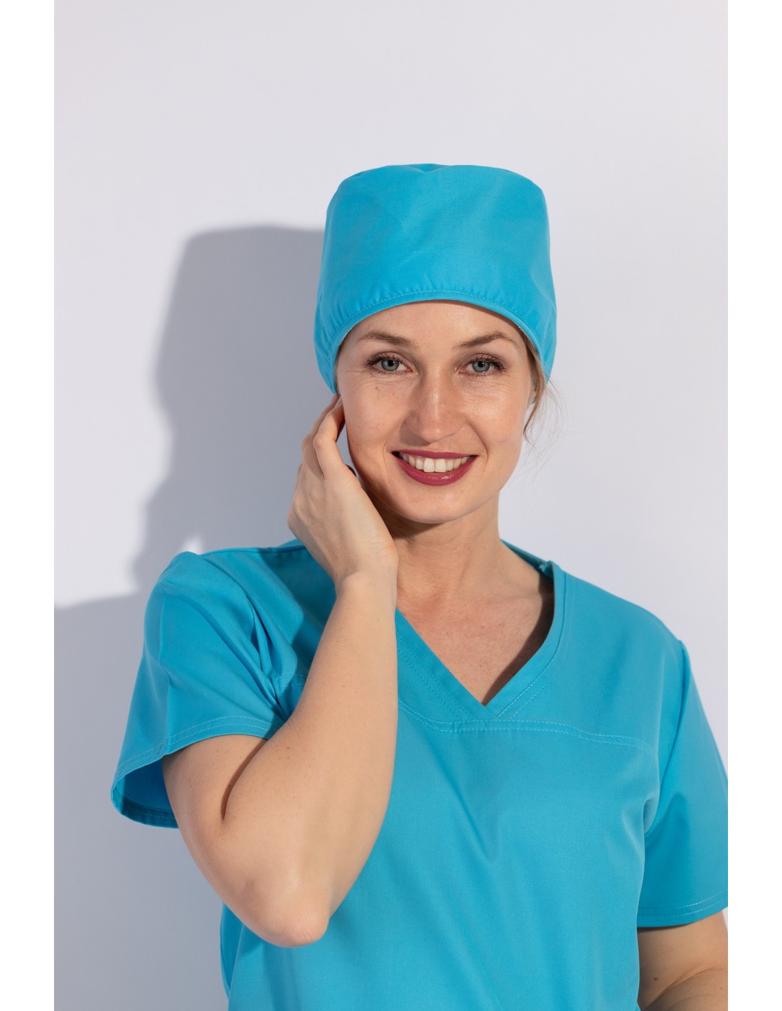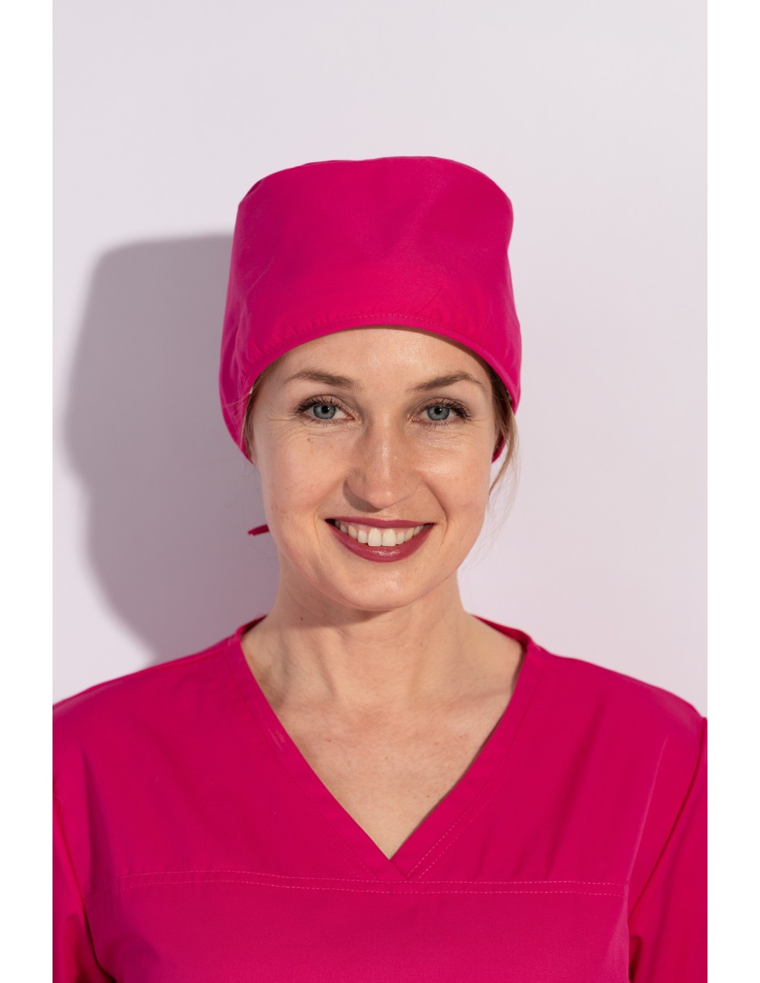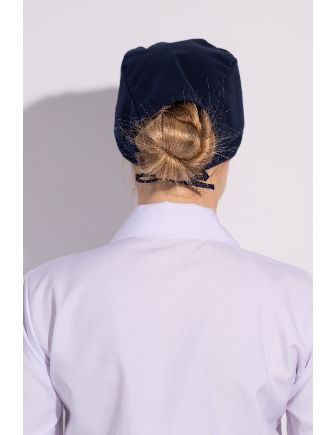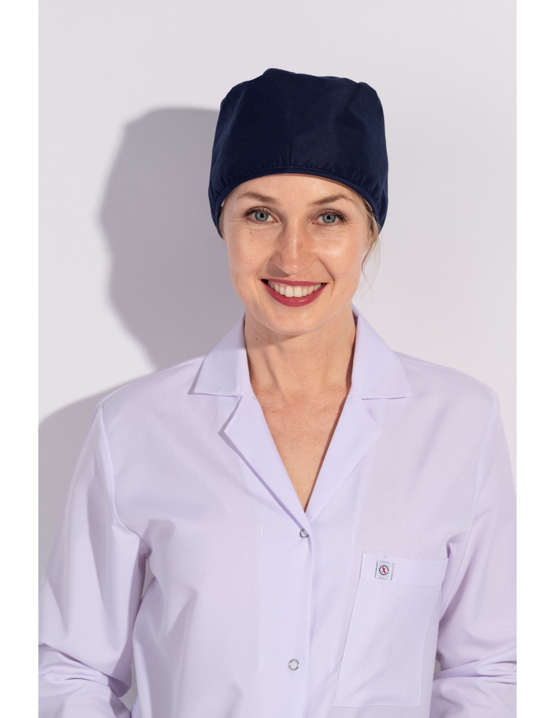 Медицинската шапка е изработена от плат със състав: 63% ПЕ, 25% П, 2% ЕЛ, 165гр/м². Моделът е от комфортна и здрава материя. Разполага с връви за по- добро прилягане към главата. Медицинската шапка е с добавена хавлиена подложка в областта на челото за по- голям комфорт при носене.